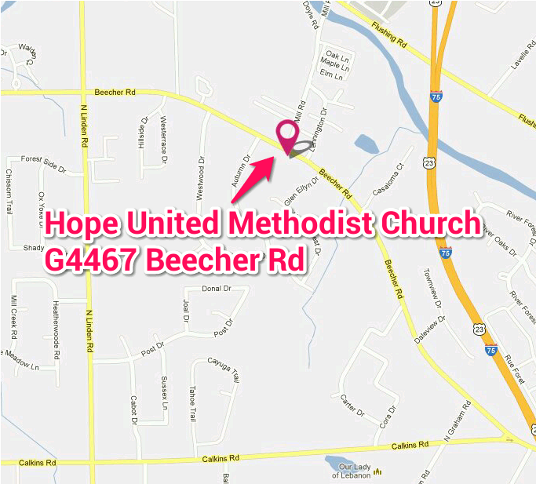 All regular meetings are held at Hope United Methodist Church, at G-4467 Beecher Rd in Flint MI. The church is on the south side of Beecher, right at the intersection of Mill Rd (about a quarter-mile east of Linden Rd)